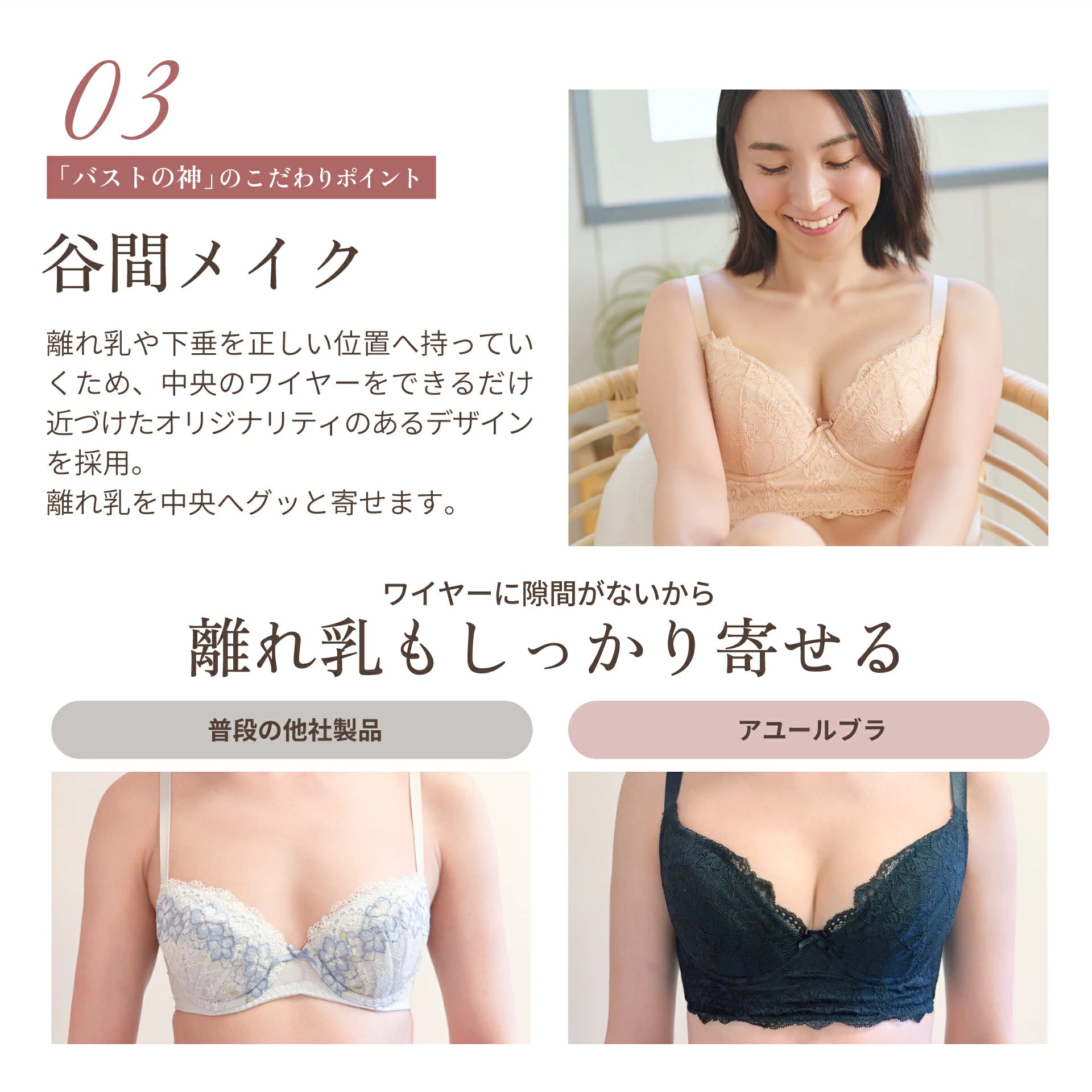 離れ乳や下垂を正しい位置へ持っていくため、中央のワイヤーをできるだけ近づけたオリジナリティのあるデザインを採用。